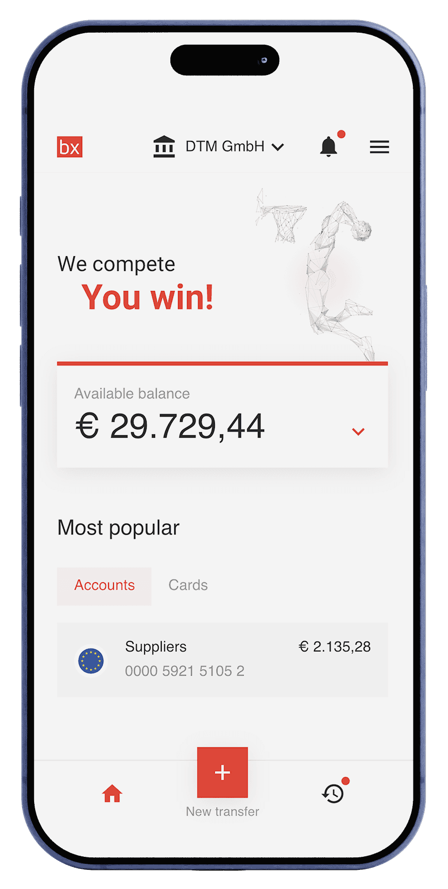 The dashboard surfaces essential information first—available balance and key accounts—using a strong typographic hierarchy.