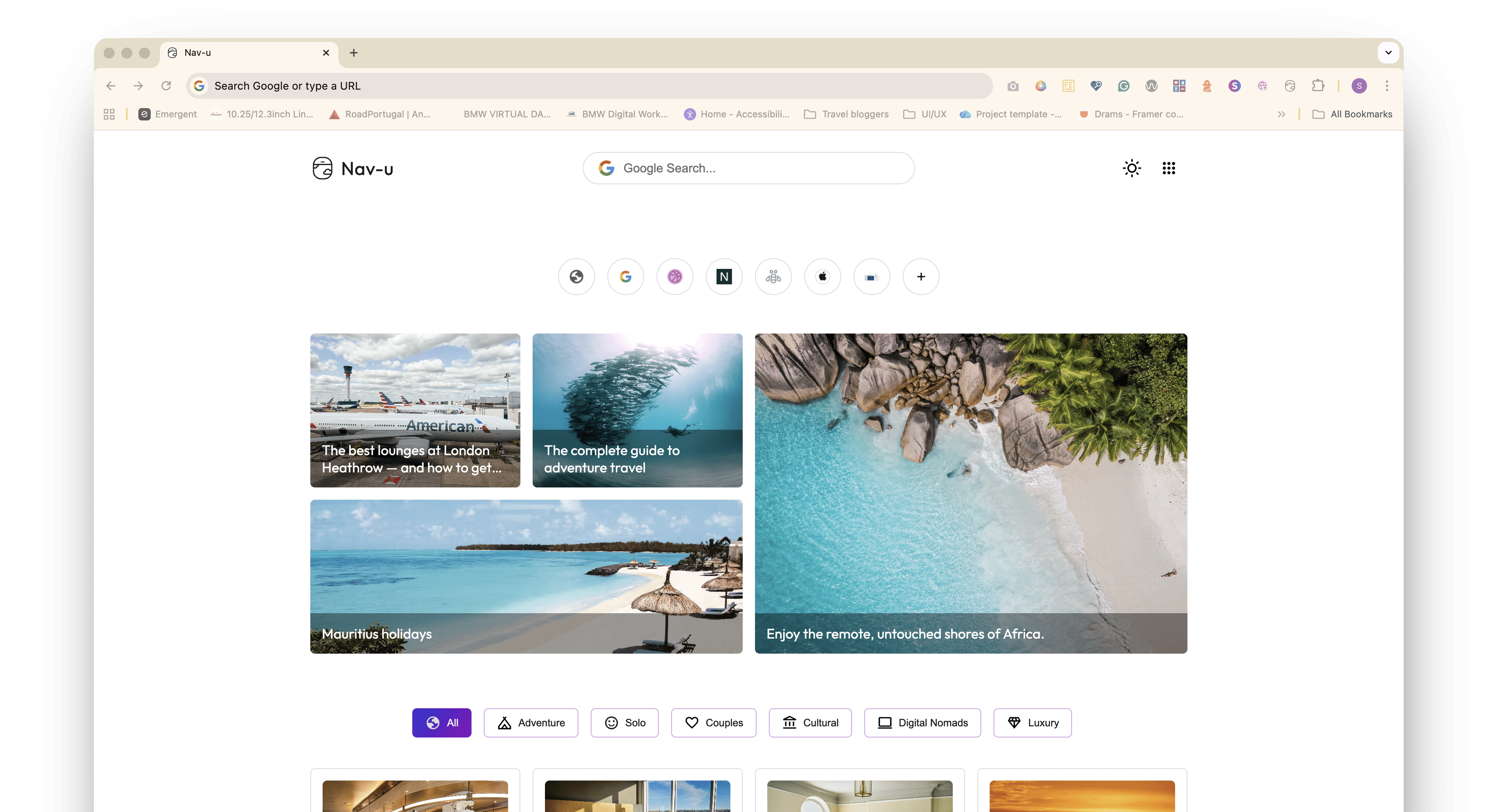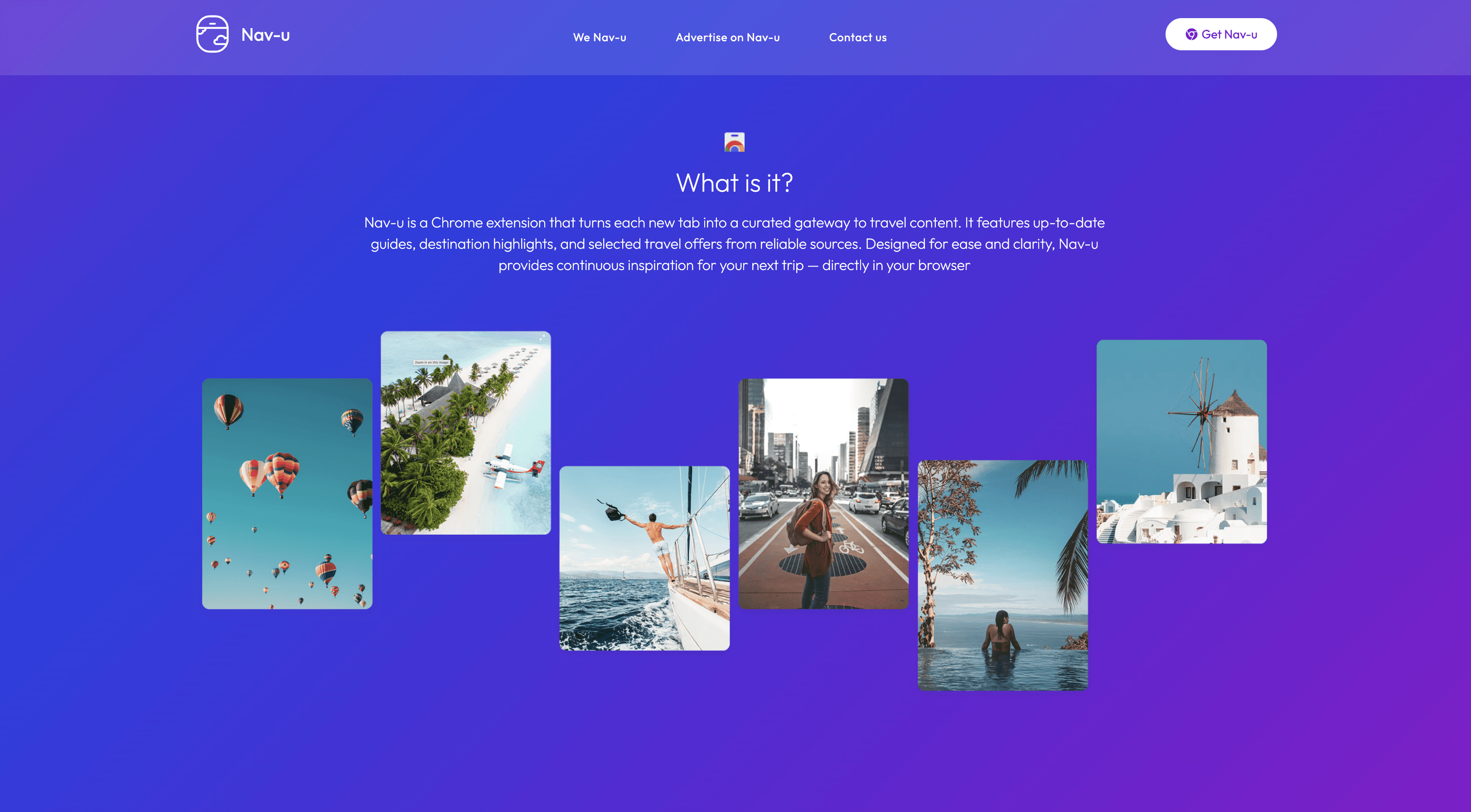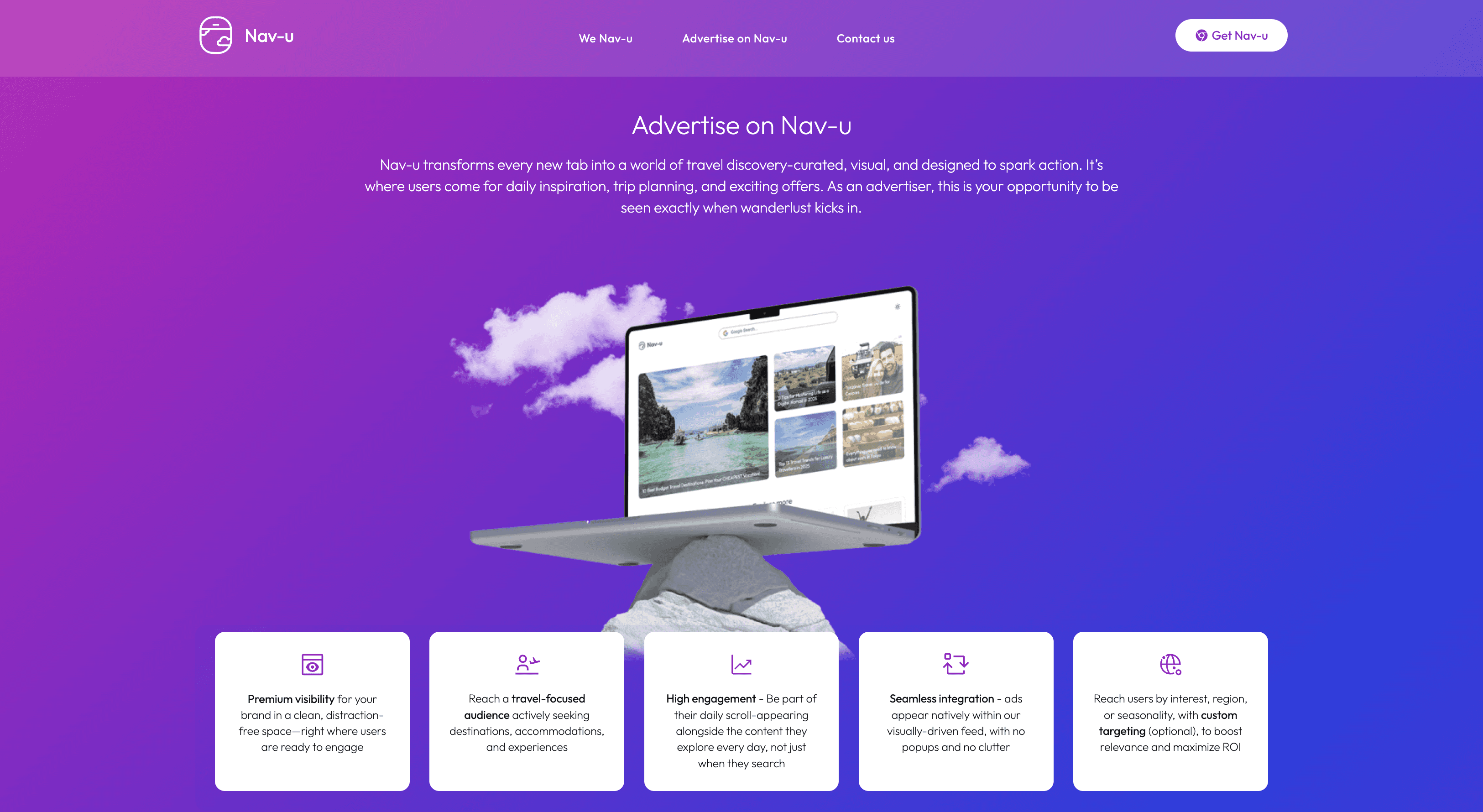 Nav-U is an entrepreneurial product concept that reimagines the browser's new tab as a high-frequency discovery and advertising surface for the travel industry. By embedding travel inspiration directly into a daily user habit, Nav-U creates continuous, low-friction exposure for destinations, travel services, and brands.
