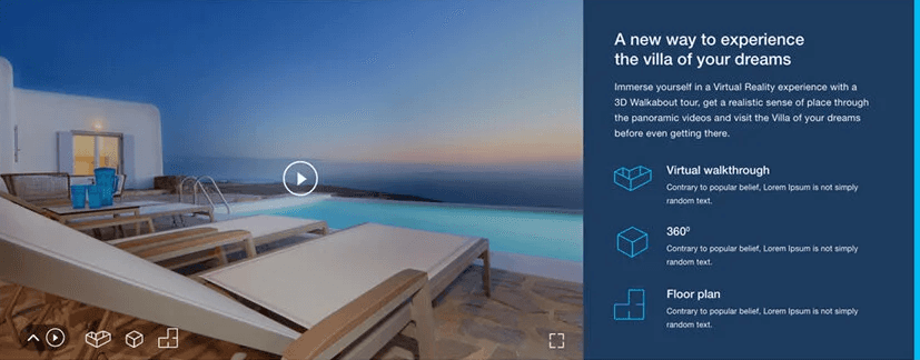 Supporting sections introduce experiential value (virtual tours, 360° views, and floor plans), reinforcing trust and helping users make high-value decisions remotely.